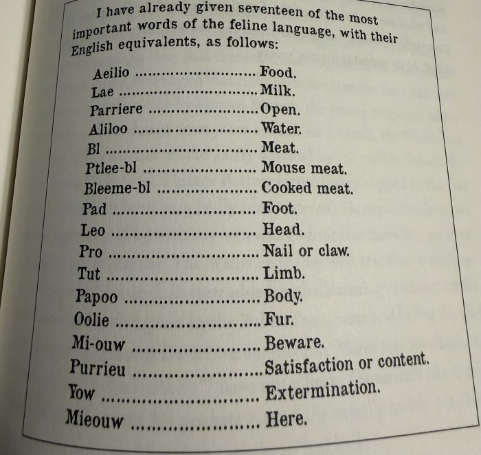 Portions of Catland also border on thesaurus vomit. After 50ish pages, I started to write down unfamiliar vocabulary whose meanings I couldn’t easily glean from surrounding passages. By the time I skimmed my way through the acknowledgements, I had compiled a list of 70 terms.